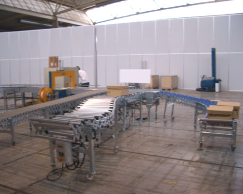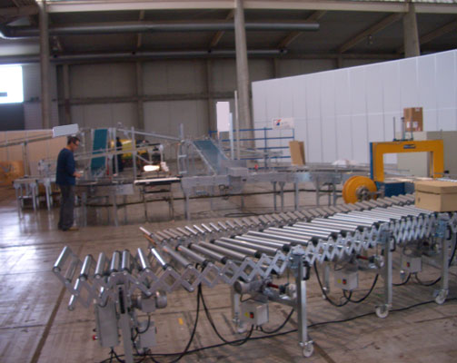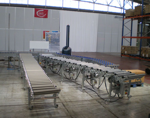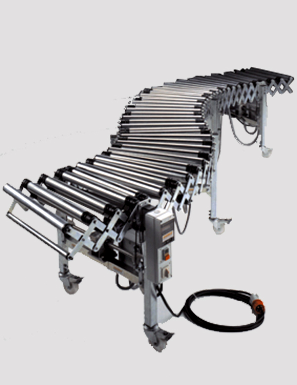 Transportador de rodillos Convex motorizado y extensible para líneas de traslado de cajas en instalaciones industriales